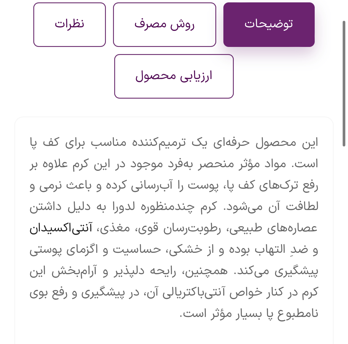 از بوی بد پا جلوگیری میکنه از عرق کردن پا هم جلوگیری میکنه فوق العاده آبرسانی و مرطوب کنندگی بالایی داره ترمیم کننده عالیه همه چی تموم